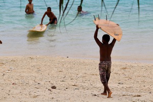 Here are some local kids playing in the water with surfboards and trying to learn the basics.