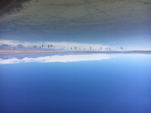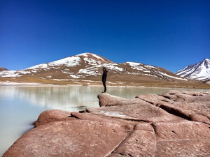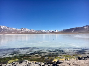 This lake is at the center of the Atacama desert. But do not get it wrong, it is very dry and desertic around. Millions of years ago this region was a giant salt water lake that have dryed out. Now the ground is mainly composed by minerals and coral fossils.