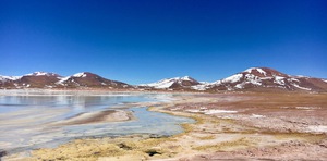 This is the lake at the Piedras Rojas in Atacama. One can distinguish the red rocks on the right side of the picture. Hard to see on the picture but the lake was actually entirely frozen.
