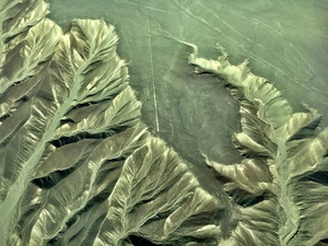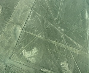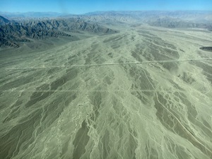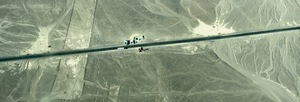 That fotograph shows the evolution of the Nazca Valley. On the right what it used to be, a giant river with water and forest. In the center, some drawings made about 2000 years ago (an iguana, a tree and officially a pair of hands - or a chicken?). And finally across the entire picture, a road made by our civilization...