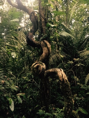 This weird looking tree is a kind of liane that grows around another tree and squeeze it so hard that it dies. By the time this happens the liane has enough time to grow a lot and grab another tree. Impressive isn't ?